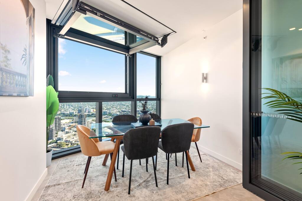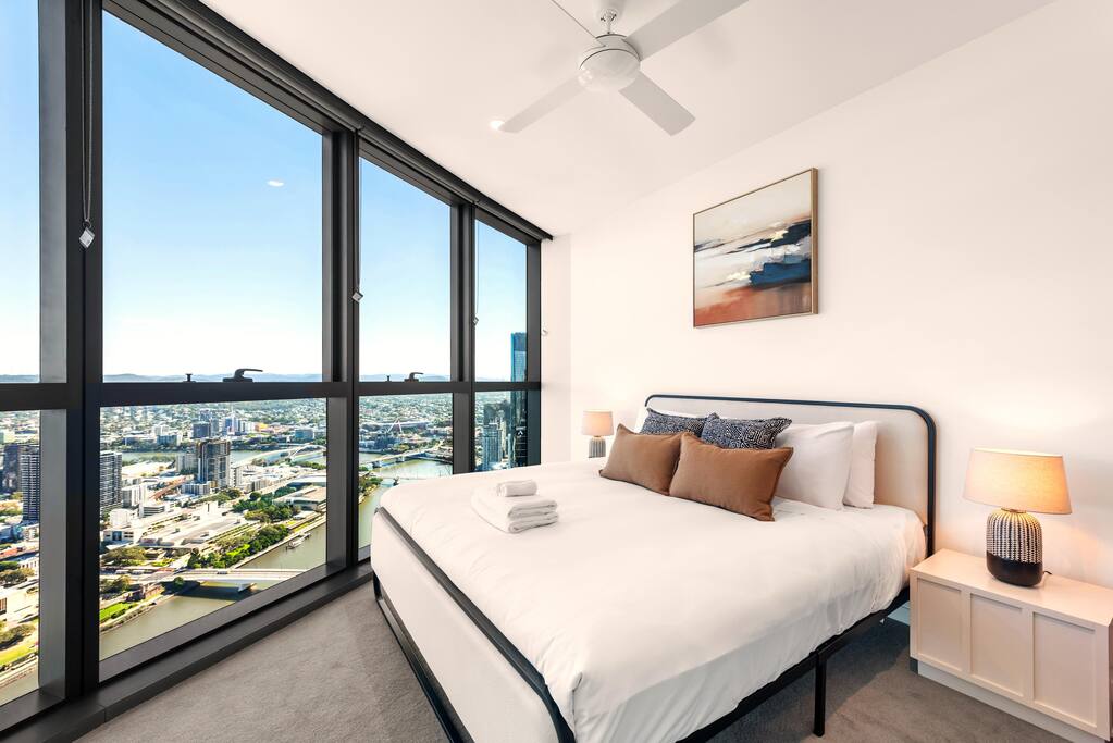 This beautiful Queen's Wharf 58th-floor apartment has been professionally designed to become an oasis of luxury, comfort, convenience, and entertainment. The open-concept living area is vibrant and lively, perfect for spending hours relaxing, watching movies, or cooking delightful treats in the fully equipped kitchen. Enjoy a homemade meal at the dining table, where natural light streams through large windows, creating a lovely atmosphere for socializing with your loved ones and marveling at the breathtaking city and river views. Explore the rest of the interior to discover three lavish bedrooms where you can rest during an unforgettable stay in Brisbane. The apartment does not have a traditional balcony, but you'll be able to open the large window, which will let the entire apartment breathe and let you feel connected to the outdoors, enjoying fresh air and natural light throughout your stay. ★ LIVING ROOM ★ The stylish, bright living room is the heart of our gorgeous apartment, creating a relaxing yet upbeat setting to unwind after an exciting day exploring the bustling streets of the Central Business District. ✔ Cozy Leather Sofa with Pillows & a Throw Blanket ✔ Smart TV ✔ Designer Sofa Chair ✔ Coffee Table ✔ Access to the Balcony ★ KITCHEN & DINING ★ The ample cabinetry in the fully equipped kitchen contains everything you need to cook up a storm. Spacious countertops and a central kitchen island provide plenty of space to work your magic. ✔ Microwave ✔ Stove ✔ Oven ✔ Toaster ✔ Coffee Maker ✔ Hot Water Kettle ✔ Refrigerator/Freezer ✔ Dishwasher ✔ Sink - Hot & Cold Water ✔ Plates ✔ Glasses ✔ Silverware ✔ Pots & Pans Feel like a Michelin-star guest while enjoying tasty meals and spectacular views by the large floor-to-ceiling windows. ✔ Dining Table with Seating for 6 ✔ Kitchen Island with Seating for 4 ★ SLEEPING ARRANGEMENTS – 3 BEDROOMS ★ After a long day exploring Brisbane's beautiful attractions and landmarks, you can retreat to one of the three comfortable bedrooms. Each bedroom is designed to make sure you get the rest you deserve. ♛ Master Bedroom: King-Size Bed, Ensuite Bathroom ♛ Bedroom 2: King-Size Bed ♛ Bedroom 3: Double Bed All bedrooms come furnished with a matching array of conveniences. ✔ Premium Mattresses, Linens, Sheets, and Pillows ✔ Closets with Hangers and Shelves ✔ Night Stands with Reading Lamps ★ BATHROOMS ★ The apartment features two bathrooms so that you can relax and refresh without any worries. Plus, it features a starter supply of essential toiletries and fresh towels to ensure a perfect, carefree stay. ✔ Walk-In Shower ✔ Vanity ✔ Mirror ✔ Toilet ✔ Towels ✔ Hair Dryer ✔ Starter Supply of Essential Toiletries (Shampoo, Conditioner, Body Wash, Toilet Paper, etc.) Let us know if you have any questions regarding our breathtaking Queen's Wharf getaway.