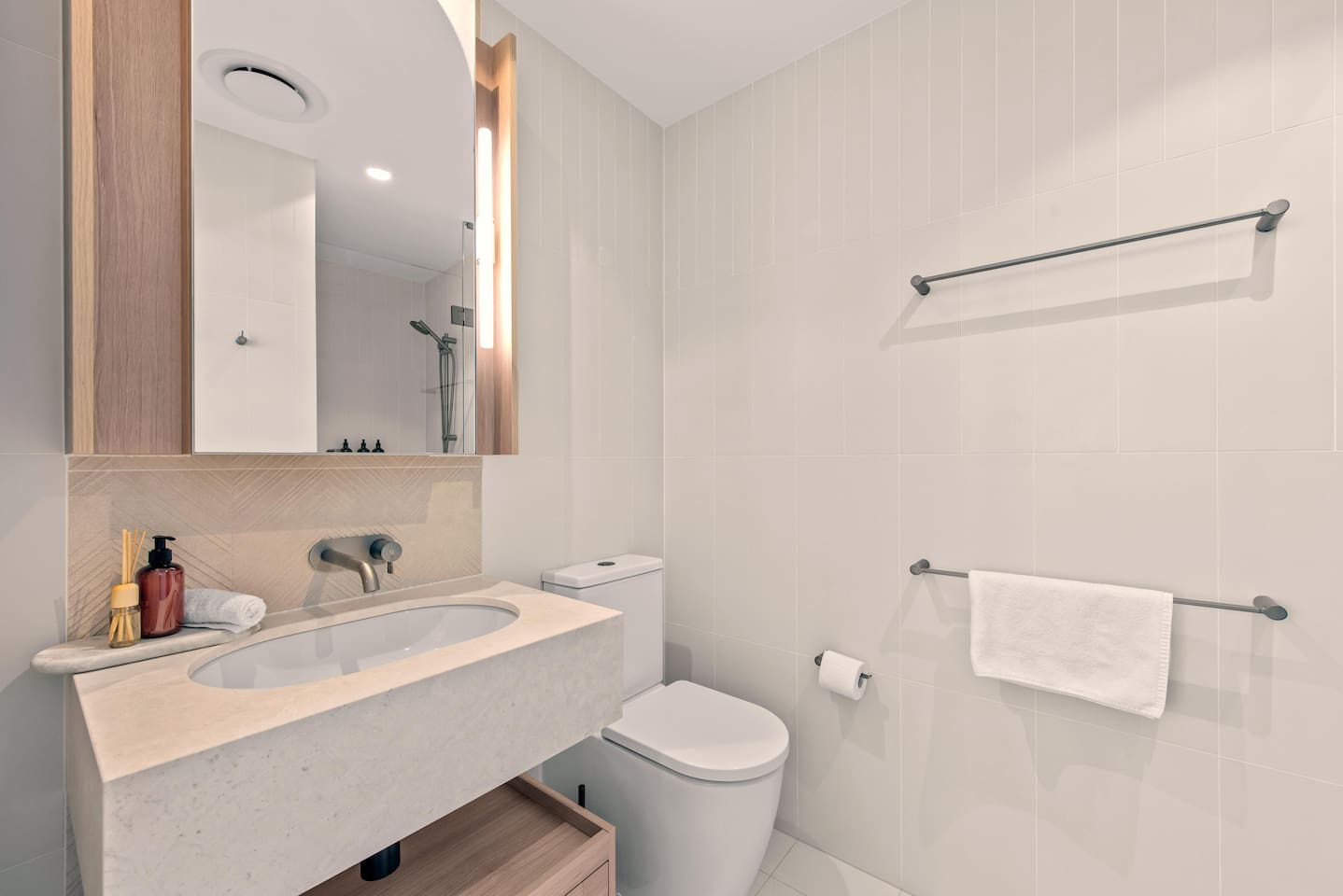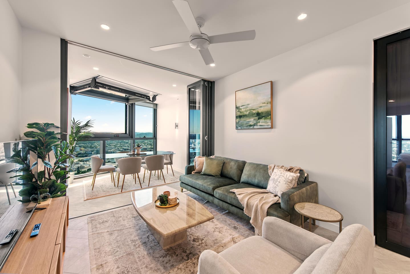 🏙️ Your Diamond-Class Brisbane Home | Queen’s Wharf Level 47 Welcome to your expansive Level 47 Diamond-Class retreat — a beautifully styled 3-bedroom apartment designed for comfort, connection and breathtaking skyline views. Blending warm beige and green tones with luxury finishes, this home offers the perfect balance of sophistication and ease. Soak up the skyline from the electric-opening Juliet-style window, enjoy sunset drinks above the city, or unwind together in the spacious open-plan living area. Whether you’re exploring South Bank, dining at The Star or attending business meetings, this home elevates your Brisbane stay. 🚗 Parking (Included) Two secure parking space is provided for your stay: ✔ Located in the building ✔ Secure, covered, well-lit ✔ Swipe card access included ✔ Height limit 2.3m ✔ Full directions + map provided in arrival guide ☀️ Living Room ✔ Relaxing Sofa with Pillows & Throw ✔ Smart TV ✔ Accent Chair & Coffee Table ✔ Electric Juliet-Style Window ✔ River & City Views 🍽️ Kitchen & Dining ✔ Oven, Stove, Microwave & Dishwasher ✔ Coffee Maker with Pods, Toaster, Kettle, Rice Cooker, Blender & Sandwich Press ✔ Tea Selection + Sugar ✔ Salt, Pepper & Cooking Oil ✔ Refrigerator/Freezer ✔ Cookware, Glassware & Utensils ✔ Kids’ Plastic Cups, Bowls & Utensils ✔ Welcome Gift, Bottled Water & Milk ✔ Dining Table for 6 ✔ Kitchen Island Seating for 4 🛏️ Sleeping Arrangements – 3 Bedrooms Master Bedroom ✔ King Bed with Premium Linens ✔ Ensuite Bathroom ✔ Built-In Wardrobe ✔ Bedside Tables with Lamps Bedroom 2 ✔ King Bed with Plush Bedding ✔ Built-In Wardrobe ✔ Bedside Tables with Lamps Bedroom 3 (Sliding Doors) A flexible enclosed room with sliding doors. ✔ Double Bed with Premium Linens ✔ Built-In Storage ✔ Soft Side Lighting Sleeps 6 comfortably. 🛁 Bathrooms (2 Total) ✔ Walk-In Shower ✔ Vanity & Mirror ✔ Fresh Towels ✔ Hair Dryer ✔ Starter Toiletries 💼 Additional Comforts ✔ No Added Cleaning Fee ✔ High-Speed Wi-Fi ✔ All-In-One Bosch Washer/Dryer ✔ Iron & Ironing Board ✔ Clothes Drying Rack ✔ Laundry Pods, Dishwashing Pods & Washing Liquid ✔ Ducted Air Conditioning & Heating ✔ Access to Pool, Gym, Sauna, Steam Room & Spa ✔ Business Centre Downstairs ✔ Kids’ Items (Cot, High Chair, Bowls, Plastic Cups, Baby Bath) 🔒 Safety Features ✔ Smoke alarms ✔ First Aid Kit ✔ Carbon monoxide detector ✔ Fire extinguisher & Blanket 🌇 Indoor Juliet-Style Balcony ✔ Electric Opening Window ✔ Indoor–Outdoor Fresh-Air Feel ✔ Beautiful River & City Views