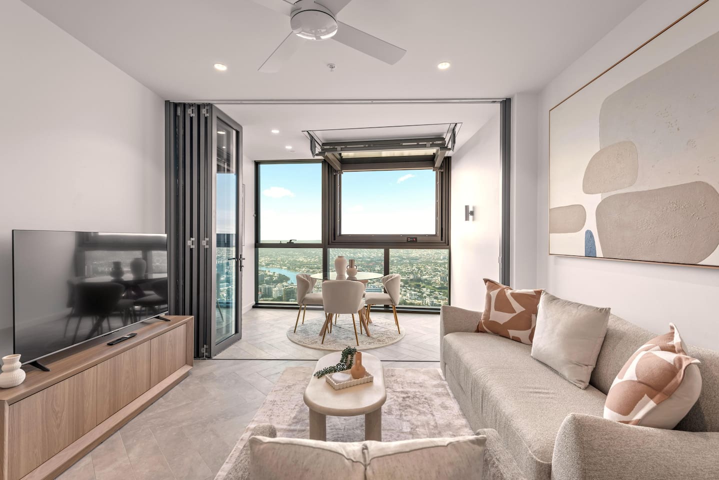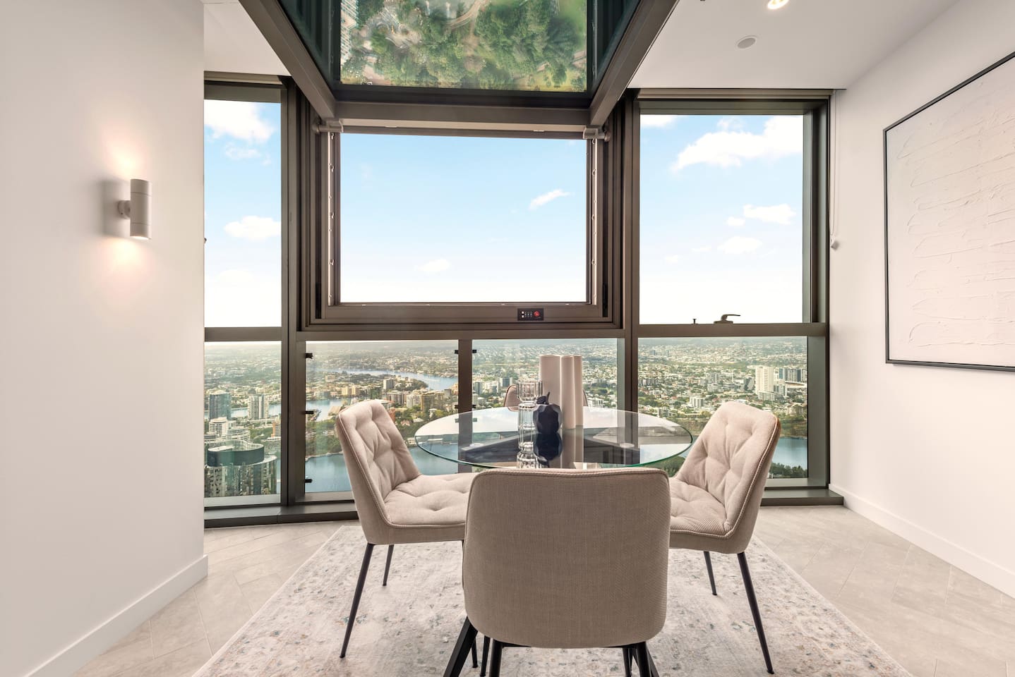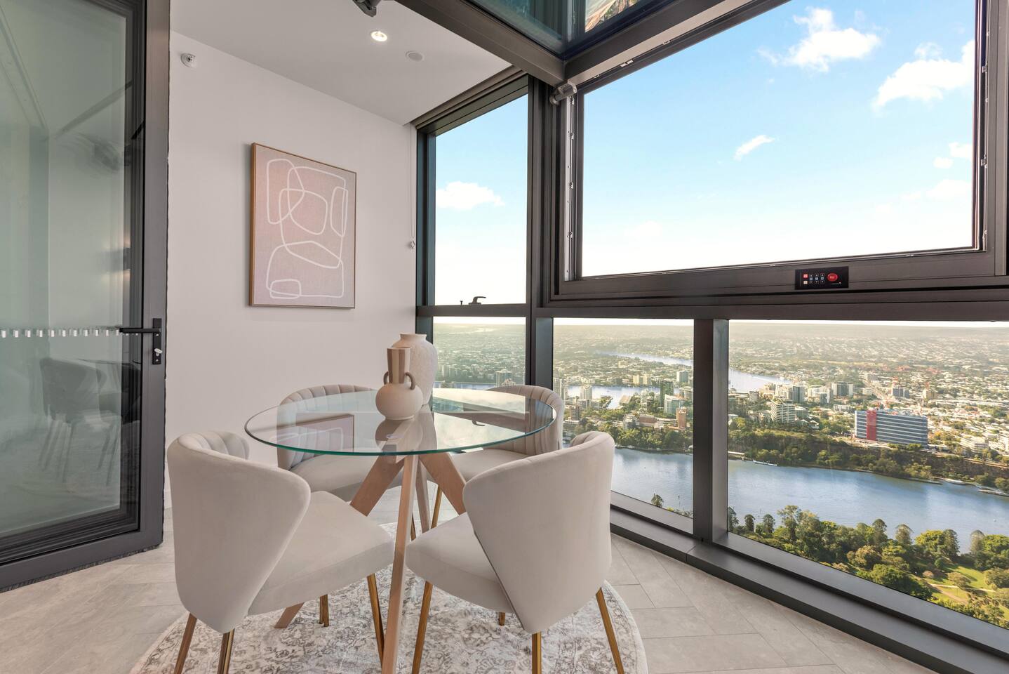 💎 Your Diamond-Class Brisbane Escape | Queen’s Wharf Level 63. Welcome to your Level 63 Diamond-Class sanctuary, where floor-to-ceiling glass, warm beige and chocolate tones, and panoramic river & skyline views create the perfect elevated retreat. Ideal for couples, corporate travellers, or a relaxed Brisbane stay, this beautifully styled home blends luxury with the warmth of home. Unwind in the bright open-plan living space, open the electric retractable windows to enjoy fresh air and city breezes, and watch Brisbane light up beneath you. Every detail is designed for calm, connection and comfort. 🚗 Parking (Included) One secure parking space is provided for your stay: ✔ Located in a nearby Wilson garage (200m away) ✔ Secure, covered, well-lit ✔ Swipe card access included ✔ Height limit 1.8m ✔ Full directions + map provided in arrival guide 🛋️ Living Room A bright, tranquil space made for relaxing, working, or enjoying the skyline. ✔ Cozy Sofa (Converts to Queen Bed) ✔ Smart TV ✔ Accent Chair & Coffee Table ✔ Floor-to-Ceiling Glass ✔ Electric Indoor Balcony Window ✔ River & City Views 🍽️ Kitchen & Dining Cook, work or unwind in this sleek, fully equipped kitchen. ✔ Oven, Stove, Microwave & Dishwasher ✔ Coffee Maker with Pods, Toaster, Kettle, Rice Cooker, Blender & Sandwich Press ✔ Tea Selection + Sugar ✔ Salt, Pepper & Cooking Oil ✔ Refrigerator/Freezer ✔ Cookware, Glassware & Utensils ✔ Bottled Water, Milk & Welcome Gift ✔ Dining Table for 4 ✔ Breakfast Bar for 2 ✔ All-in-One Bosch Washer/Dryer 🛏️ Bedroom Your serene retreat with soft textures, warm lighting and skyline views. ✔ King Bed with Premium Linens ✔ Ensuite Bathroom ✔ Built-In Wardrobe ✔ Bedside Tables with Lamps 🛁 Bathroom Fresh, modern and fully stocked for a comfortable stay. ✔ Walk-In Shower & Vanity ✔ Fresh Towels ✔ Hair Dryer ✔ Starter Toiletries 🔒 Safety Features ✔ Smoke alarms ✔ First Aid Kit ✔ Carbon monoxide detector ✔ Fire extinguisher & Blanket 💼 Additional Comforts ✔ No Added Cleaning Fee ✔ High-Speed Wi-Fi ✔ All-In-One Bosch Washer/Dryer ✔ Iron & Ironing Board ✔ Clothes Drying Rack ✔ Laundry Pods, Dishwashing Pods & Washing Liquid ✔ Ducted Air Conditioning & Heating ✔ Pool, Gym, Sauna and Steam Room Access ✔ Business Centre Downstairs with Dedicated Workspace Areas ✔ Kids’ Items Always Available (Cot, High Chair, Bowls, Plastic Cups, Baby Bath) 🌇 Indoor Balcony (Electric Window) Your elevated viewpoint over Brisbane: ✔ Large Electric Opening Window ✔ Open-Air Juliet Feel ✔ Stunning River & Skyline Views Perfect for morning coffee, laptop work or sunset wine.