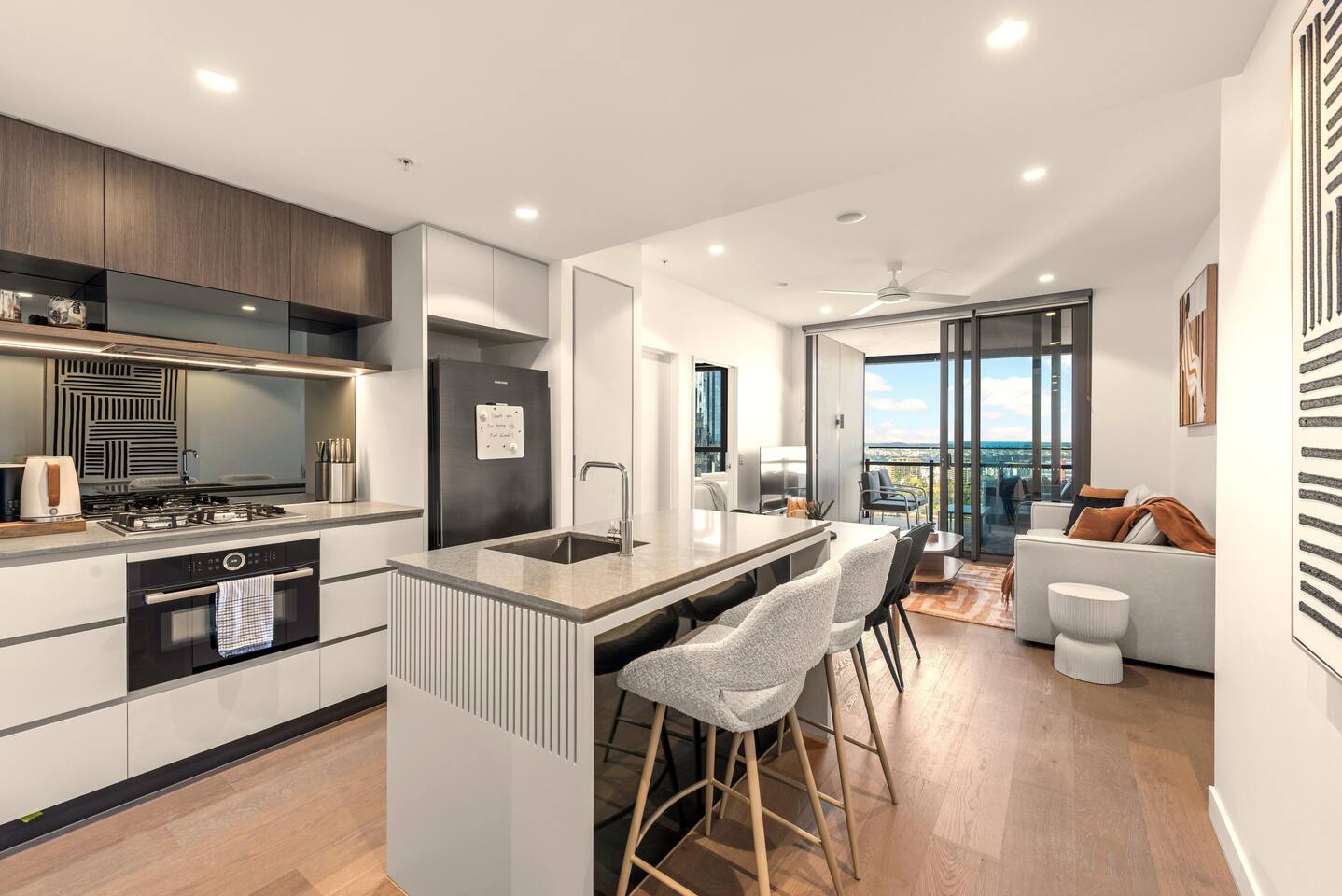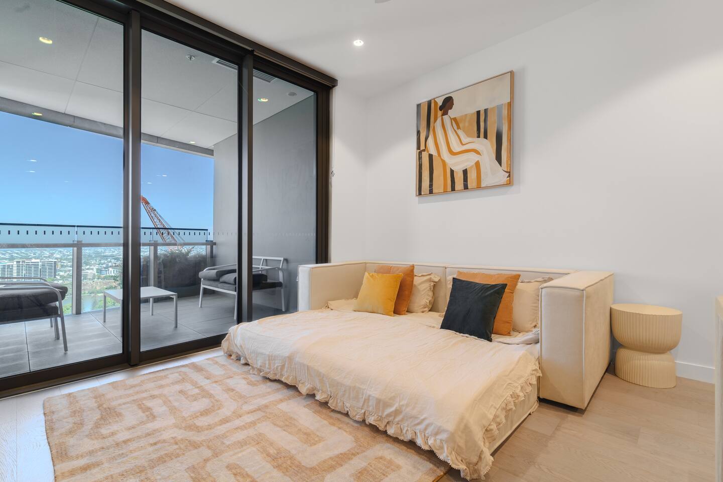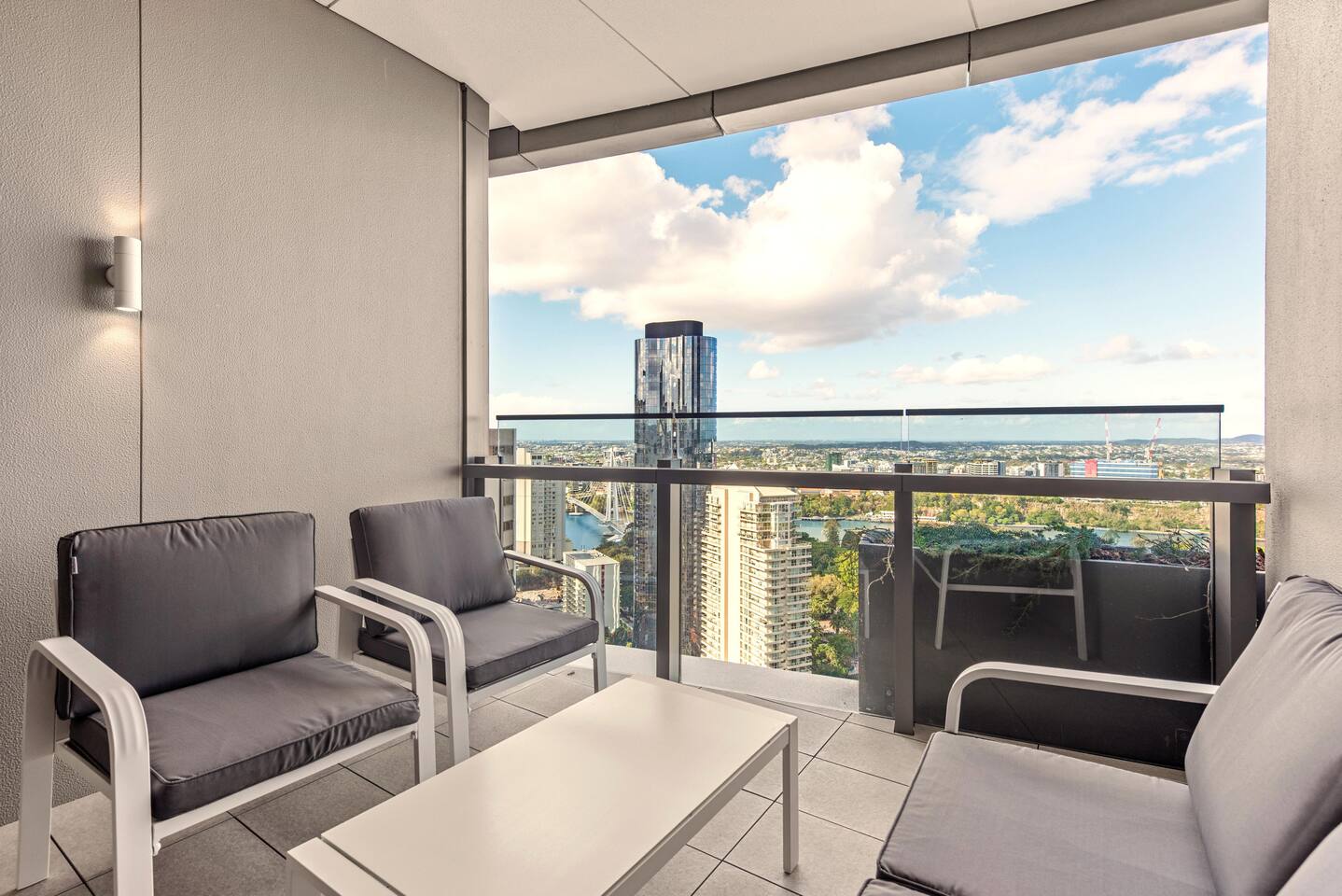 🏙️ Your Open-Air Brisbane Escape | Queen’s Wharf Level 25 Step into this elegant 25th-floor retreat, where open-air living, warm neutral tones and modern comfort meet sweeping river and city views. With a true outdoor balcony and a beautifully styled interior, this Queen’s Wharf apartment is perfect for couples, families, business travellers and weekend explorers. Whether you’re visiting South Bank, the Botanic Gardens, attending an event, or enjoying Brisbane’s dining scene, this stylish home offers the ideal base. 🚗 Parking (Included) One secure parking space is provided for your stay: ✔ Located in a nearby Wilson garage (200m away) ✔ Secure, covered, well-lit ✔ Swipe card access included ✔ Height limit 1.8m ✔ Full directions + map provided in arrival guide ☀️ Living Room Bright, airy, and designed for relaxing with views from every angle. ✔ Comfortable Sofa (Converts to Queen Bed) ✔ Smart TV ✔ Coffee Table ✔ Balcony Access ✔ River & City Skyline Views 🍽️ Kitchen & Dining Fully equipped for cooking, working, or enjoying relaxed meals at home. ✔ Oven, Stove, Microwave & Dishwasher ✔ Coffee Maker with Pods, Toaster, Kettle, Rice Cooker, Blender & Sandwich Press ✔ Tea Selection + Sugar ✔ Salt, Pepper & Cooking Oil ✔ Refrigerator/Freezer ✔ Cookware, Glassware & Utensils ✔ Kids Plastic Bowls, Cups & Cutlery ✔ Bottled Water, Milk & Welcome Gift ✔ Dining Table for 4 ✔ Breakfast Bar for 2 🛏️ Bedroom A peaceful king suite with soft textures and your own private balcony access. ✔ King Bed with Premium Linens ✔ Ensuite Bathroom ✔ Built-In Wardrobe ✔ Bedside Tables with Lamps ✔ Direct Balcony Access 🛁 Bathroom Modern, spotless and stocked with essentials. ✔ Walk-In Shower & Vanity ✔ Fresh Towels ✔ Hair Dryer ✔ Starter Toiletries 🌿 Private Outdoor Balcony Your open-air sanctuary above the city. ✔ Lounge Seating for 4 ✔ River & Skyline Views ✔ Perfect for morning coffee or sunset wine 🔒 Safety Features ✔ Smoke alarms ✔ Carbon monoxide detector ✔ Fire extinguisher 💼 Additional Comforts ✔ No Added Cleaning Fee ✔ High-Speed Wi-Fi ✔ All-In-One Bosch Washer/Dryer ✔ Iron & Ironing Board ✔ Clothes Drying Rack ✔ Laundry Pods, Dishwashing Pods & Washing Liquid ✔ Ducted Air Conditioning & Heating ✔ Pool, Gym, Sauna and Steam Room Access ✔ Business Centre Downstairs with dedicated workspaces ✔ Kids’ Items Always Available (Cot, High Chair & Baby Bath)