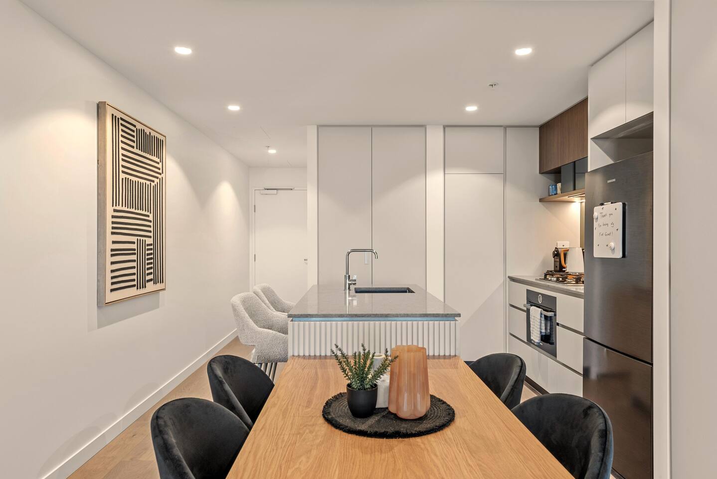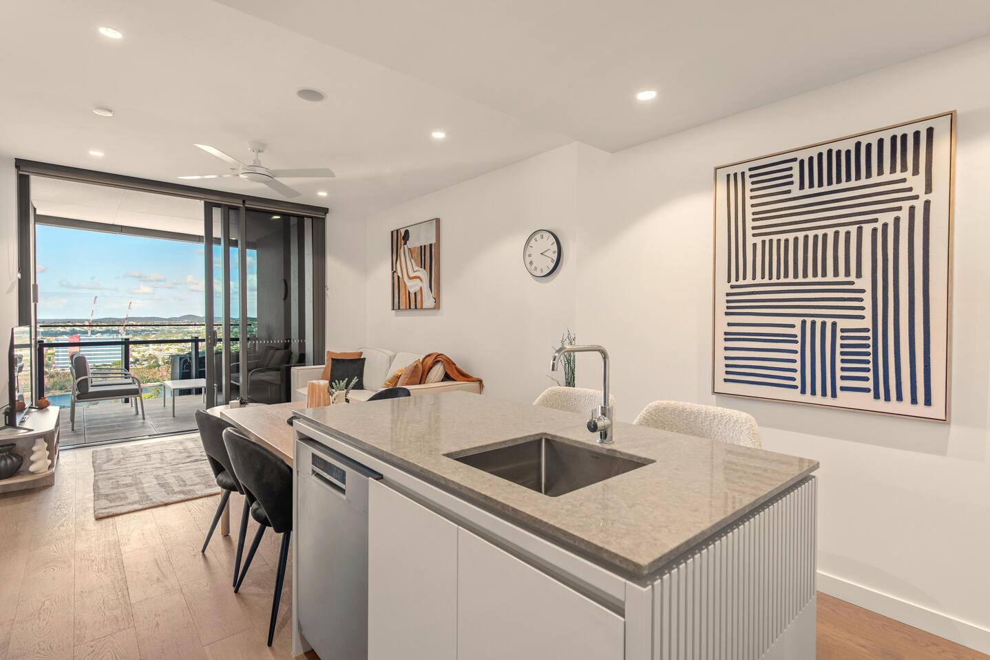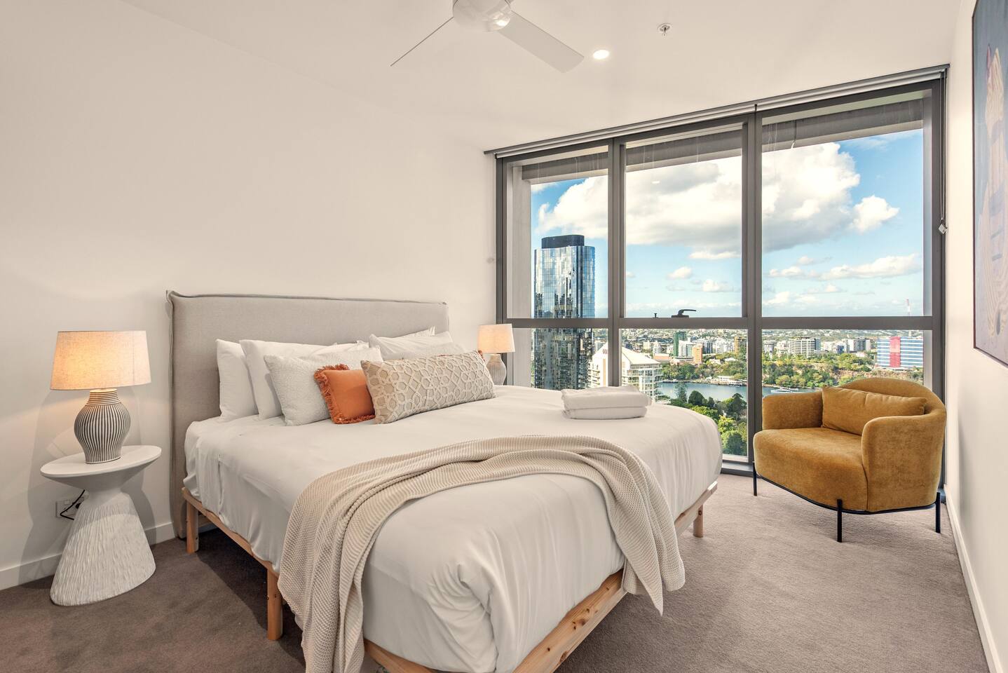 🏙️ Your Open-Air Brisbane Escape | Queen’s Wharf Level 25 Step into this elegant 25th-floor retreat, where open-air living, warm neutral tones and modern comfort meet sweeping river and city views. With a true outdoor balcony and a beautifully styled interior, this Queen’s Wharf apartment is perfect for couples, families, business travellers and weekend explorers. Whether you’re visiting South Bank, the Botanic Gardens, attending an event, or enjoying Brisbane’s dining scene, this stylish home offers the ideal base. 🚗 Parking (Included) One secure parking space is provided for your stay: ✔ Located in a nearby Wilson garage (200m away) ✔ Secure, covered, well-lit ✔ Swipe card access included ✔ Height limit 1.8m ✔ Full directions + map provided in arrival guide ☀️ Living Room Bright, airy, and designed for relaxing with views from every angle. ✔ Comfortable Sofa (Converts to Queen Bed) ✔ Smart TV ✔ Coffee Table ✔ Balcony Access ✔ River & City Skyline Views 🍽️ Kitchen & Dining Fully equipped for cooking, working, or enjoying relaxed meals at home. ✔ Oven, Stove, Microwave & Dishwasher ✔ Coffee Maker with Pods, Toaster, Kettle, Rice Cooker, Blender & Sandwich Press ✔ Tea Selection + Sugar ✔ Salt, Pepper & Cooking Oil ✔ Refrigerator/Freezer ✔ Cookware, Glassware & Utensils ✔ Kids Plastic Bowls, Cups & Cutlery ✔ Bottled Water, Milk & Welcome Gift ✔ Dining Table for 4 ✔ Breakfast Bar for 2 🛏️ Bedroom A peaceful king suite with soft textures and your own private balcony access. ✔ King Bed with Premium Linens ✔ Ensuite Bathroom ✔ Built-In Wardrobe ✔ Bedside Tables with Lamps ✔ Direct Balcony Access 🛁 Bathroom Modern, spotless and stocked with essentials. ✔ Walk-In Shower & Vanity ✔ Fresh Towels ✔ Hair Dryer ✔ Starter Toiletries 🌿 Private Outdoor Balcony Your open-air sanctuary above the city. ✔ Lounge Seating for 4 ✔ River & Skyline Views ✔ Perfect for morning coffee or sunset wine 🔒 Safety Features ✔ Smoke alarms ✔ Carbon monoxide detector ✔ Fire extinguisher 💼 Additional Comforts ✔ No Added Cleaning Fee ✔ High-Speed Wi-Fi ✔ All-In-One Bosch Washer/Dryer ✔ Iron & Ironing Board ✔ Clothes Drying Rack ✔ Laundry Pods, Dishwashing Pods & Washing Liquid ✔ Ducted Air Conditioning & Heating ✔ Pool, Gym, Sauna and Steam Room Access ✔ Business Centre Downstairs with dedicated workspaces ✔ Kids’ Items Always Available (Cot, High Chair & Baby Bath)
